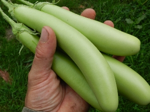 AUBERGINE - Solanum melongena 'Harabegan'Typische boulanger. Dunne langwerpige aubergine met fijne smaak. Groen van kleur. Kan ook buiten, maar hogere opbrengst onder beschutting. Struikvormend. |